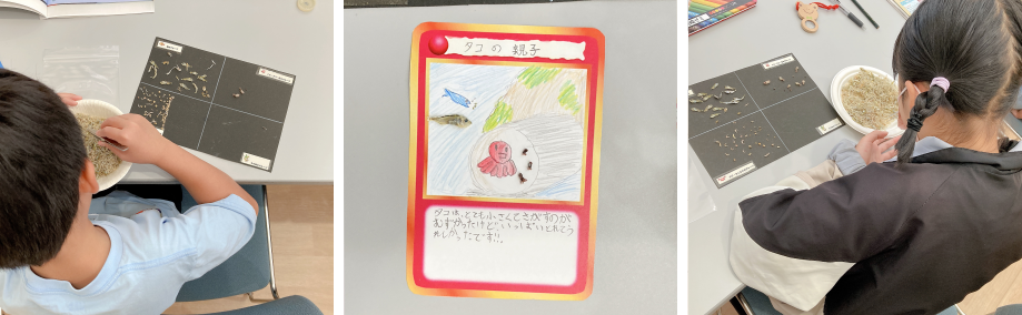 春日井市の子育て子育ち総合支援館(かすがいげんきっ子センター)で、ちりめんを使った海の生き物のワークショップを開催しました。今年もたくさんの小学生たちと、ちりめんの中にまぎれこんでいる小さな生き物たちを探しました。今年は、カワハギの赤ちゃんがたくさんいて、可愛かったです。各々、カードやキーホルダーを作りました。(2024.7.26)